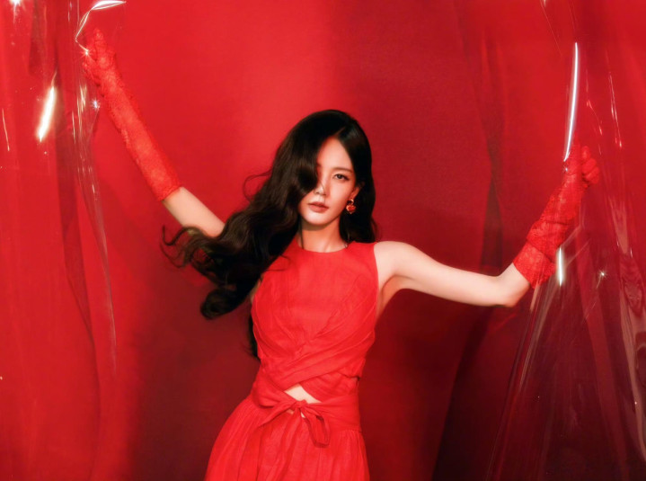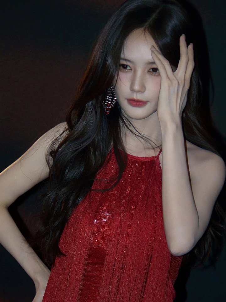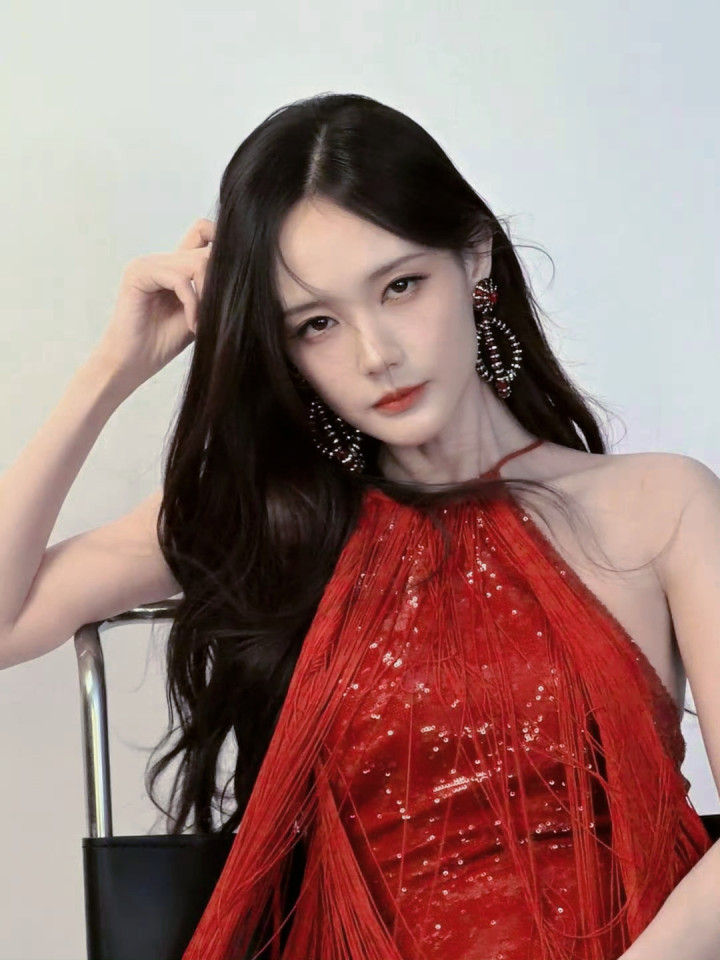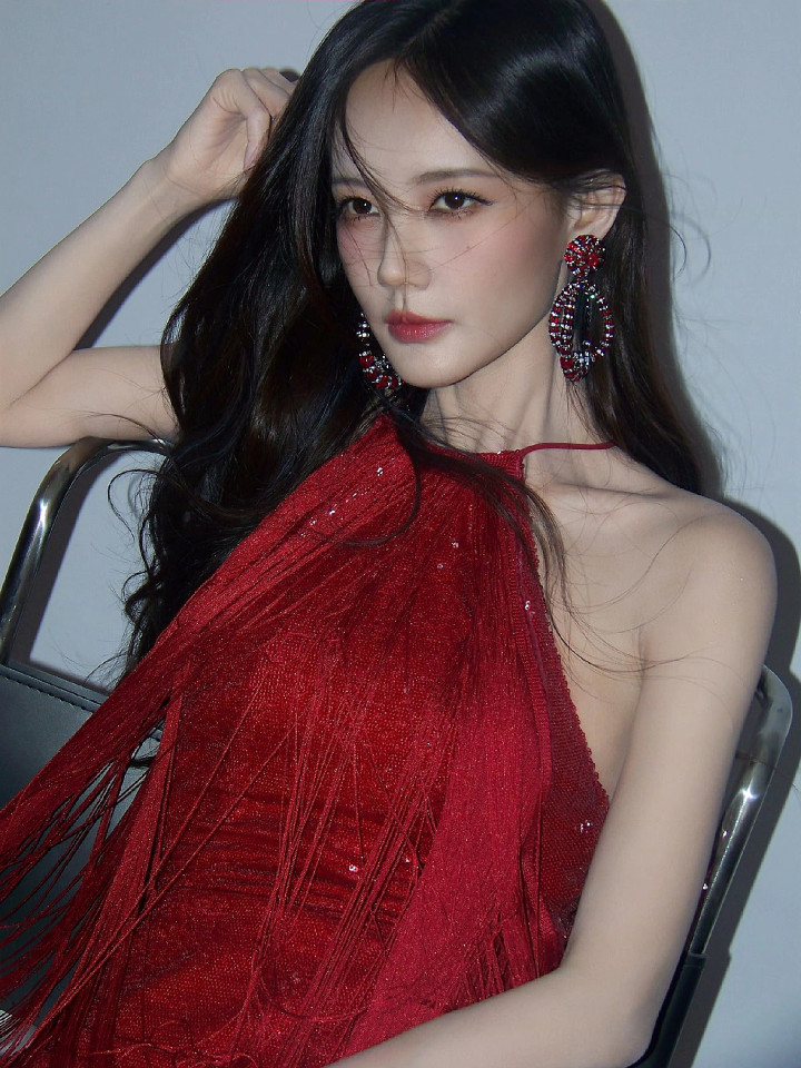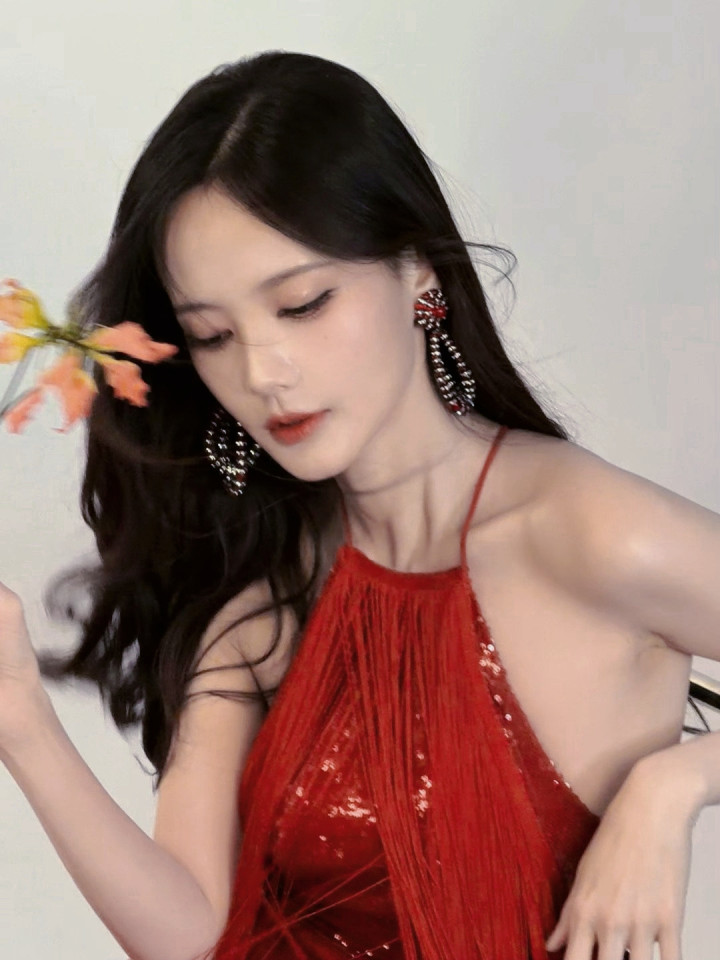 暗调布景中,流苏红衫泛着细碎光辉,垂坠的线条唾手脚轻晃,自带灵动韵律。她抬手轻拂额前发丝,耳间的端淑耳环与红衫交相照映,精细的骨相在光影下愈发立体。