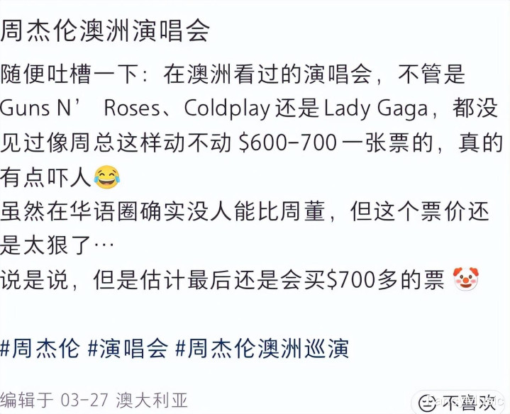 他对国表里倒是一视同仁,在国际的演唱会雷同拉垮,本年下半年的澳洲演唱会官宣订价之后,歌迷皆烦恼纷纷,训斥起了他的高票价。