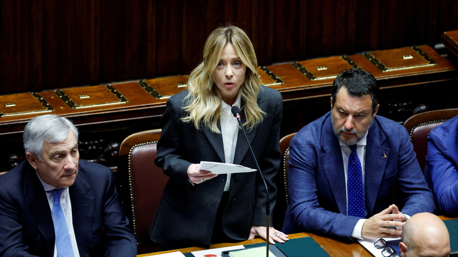 4月9日,意大利总理梅洛尼(中)在位于皆门罗马的议会上发表谈话。\n 新华社