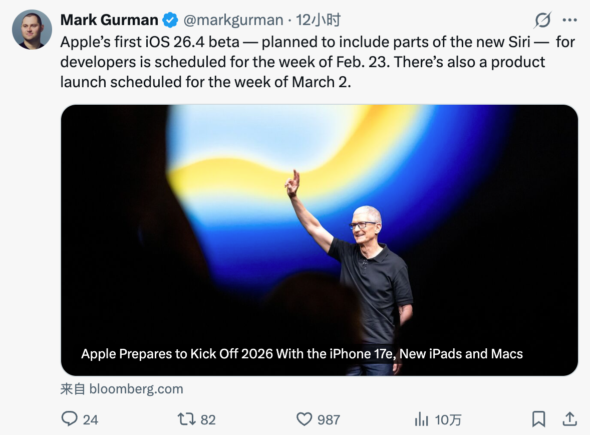 {jz:field.toptypename/}软件方面,苹果揣度打算在2月23日当周,向开辟者推送iOS 26.4首个测试版,系统将搭载新版Siri部分功能,为用户带来更智能的交互体验,这亦然苹果抓续优化语音助手的进击算作。