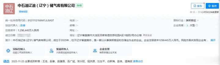 11月24日,中石油辽油(辽宁)储气库有限公司正经完成注册登记。