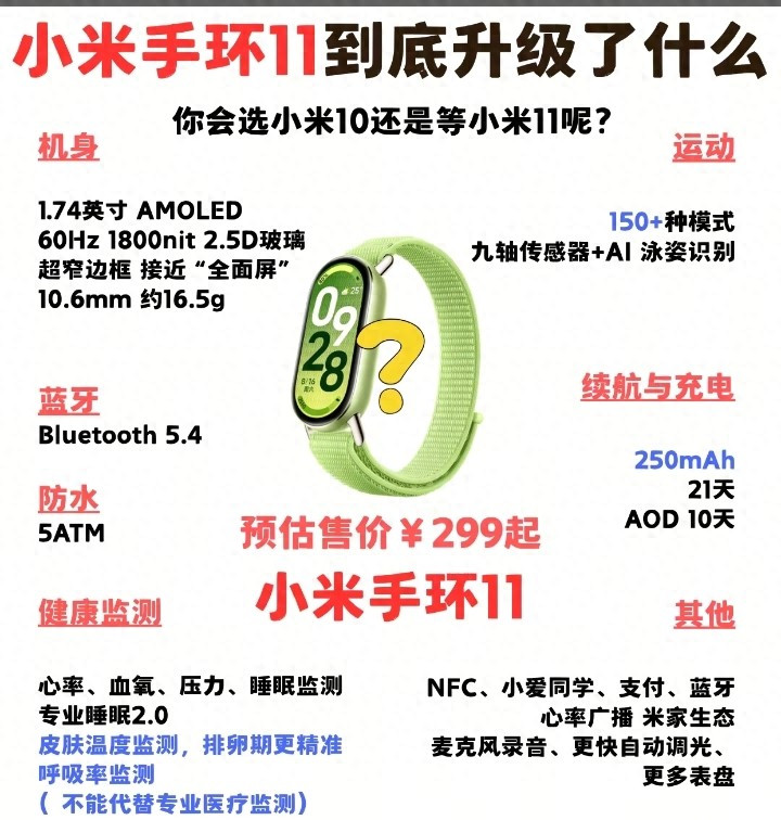 详尽来看,小米手环11比拟前代居品主要升级了以下几个部分。屏幕尺寸和亮度进一步普及,达到了1.74英寸和1800尼特。蓝牙版块升级到5.4,相连更显露。健康监测新增了皮肤温度监测和呼吸率监测,况兼寝息算法升级到专科2.0版块。敞开方面加多了九轴传感器和AI泳姿识别。续航和充电保握了较高水平。智能交互方面加多了麦克风灌音和更快的光泽感应调光。这些升级使得小米手环11在两百元到三百元价位段中具有很强的竞争力。