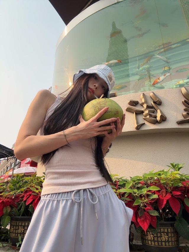 她坐在街边的高凳,对着镜头卖着萌,也会对着一颗鼓胀的椰子大口吸吮清甜的汁水。仙女的浩荡,是她四肢清醒员的另一面。