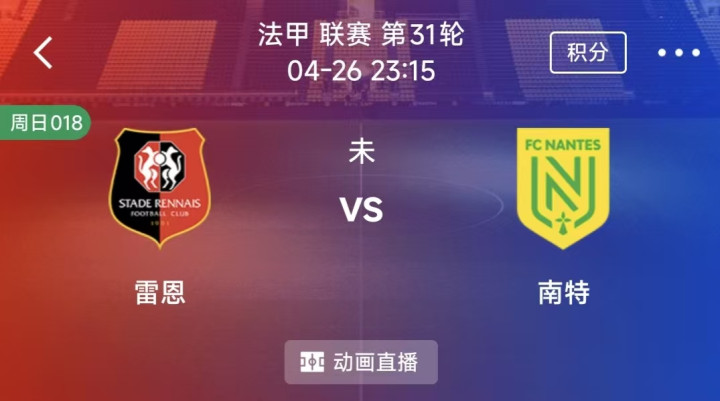018法甲:雷恩VS南特 技巧:2026-04-26 23:15
